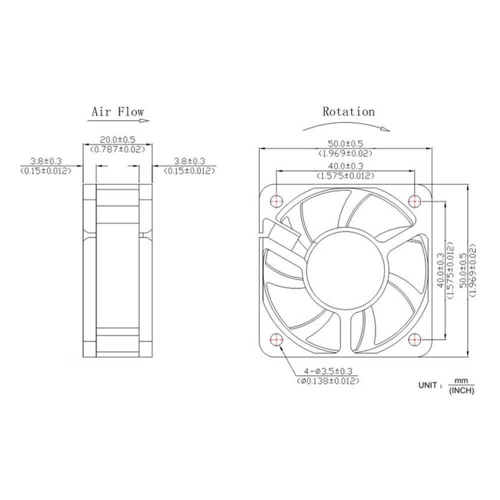 Voltage: DC 5V Current: 0.2A Power: 1W Speed: 5000RPM Air Flow: 17.36 CFM 0.49 Cubic meters / min Air pressure 6.35mmAq 0.25In H2O Noise 32.2dBA Connector 2 pin Bearing Type Sleeve